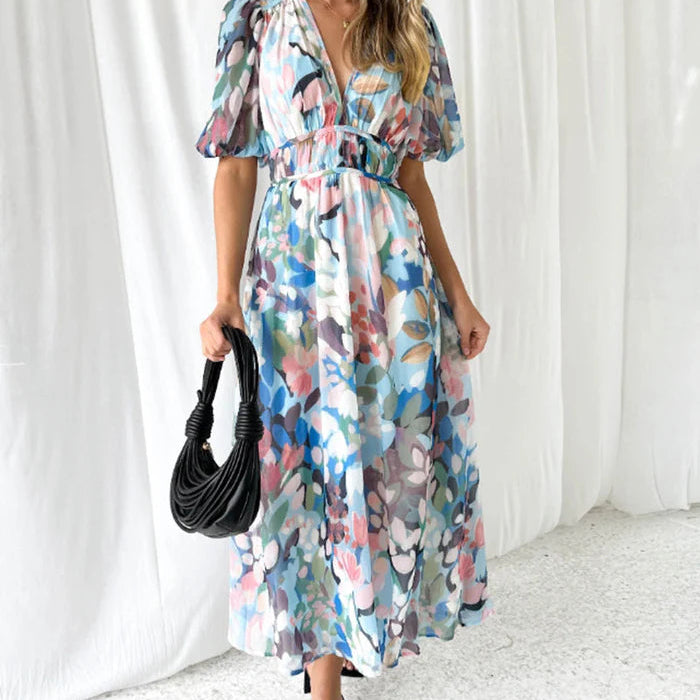 Women’s Floral Chiffon Maxi Dress – One-Shoulder Puff Sleeve