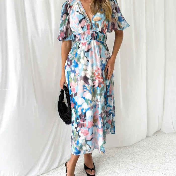 Women’s Floral Midi Dress – V-Neck Wrap Style with Puff Sleeves