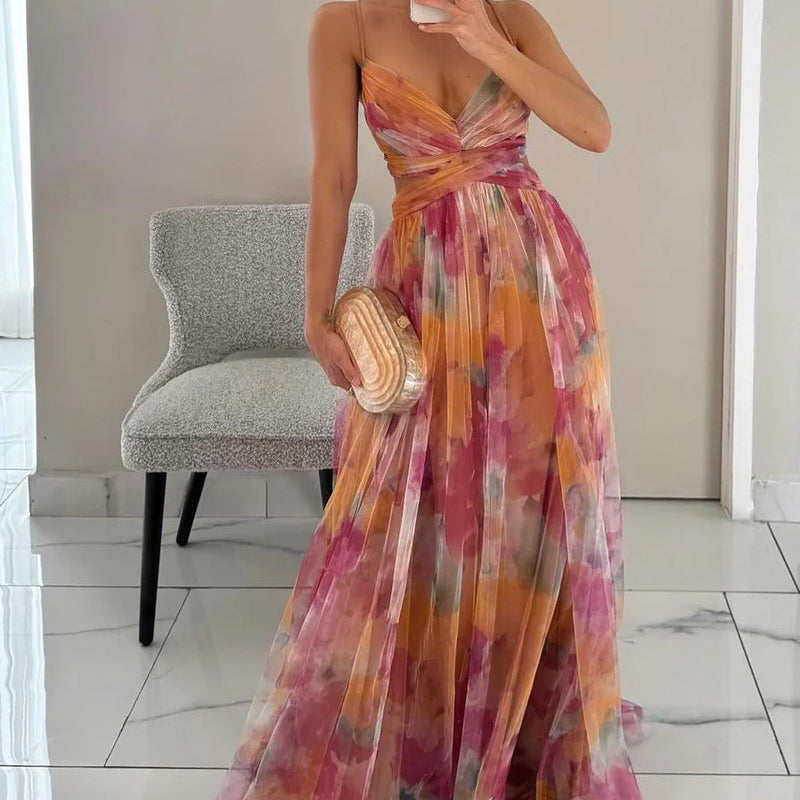 Women's Watercolor Chiffon Maxi Dress – Spaghetti Strap Backless Evening Gown