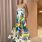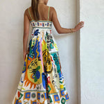 Turn heads with this statement maxi dress featuring a vivid abstract sun and moon print. Designed with slim shoulder straps and a relaxed, flowing silhouette, it combines artistic charm with effortless summer style. Crafted from lightweight, breathable fabric, this dress moves beautifully with every step—perfect for beach days, brunch dates, or sunny getaways.