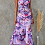 Women’s One-Shoulder Floral Print Midi Dress – High-Low Hem Ruched Design