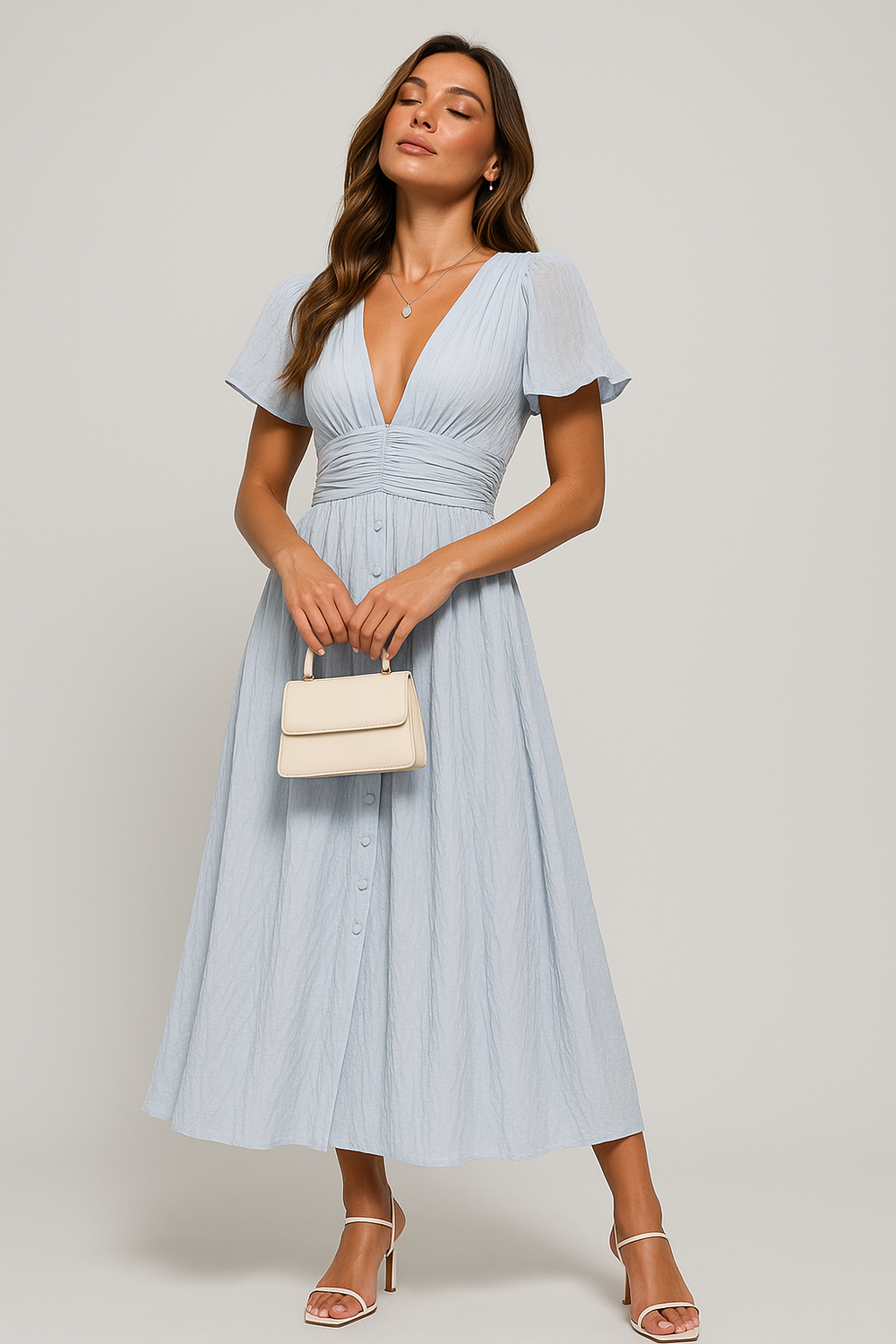 This women’s midi dress blends modern elegance with a feminine silhouette. Featuring short puff sleeves, a deep V-neckline, and a button-front closure, it’s designed with a defined waist and flowing A-line skirt for a flattering fit. Lightweight and versatile, this dress transitions effortlessly from daytime wear to evening occasions, making it a wardrobe essential.
