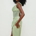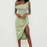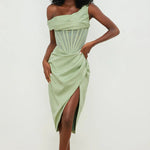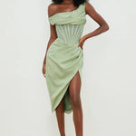 One-Shoulder Draped Midi Dress – Corset Waist & Side Split