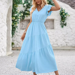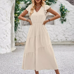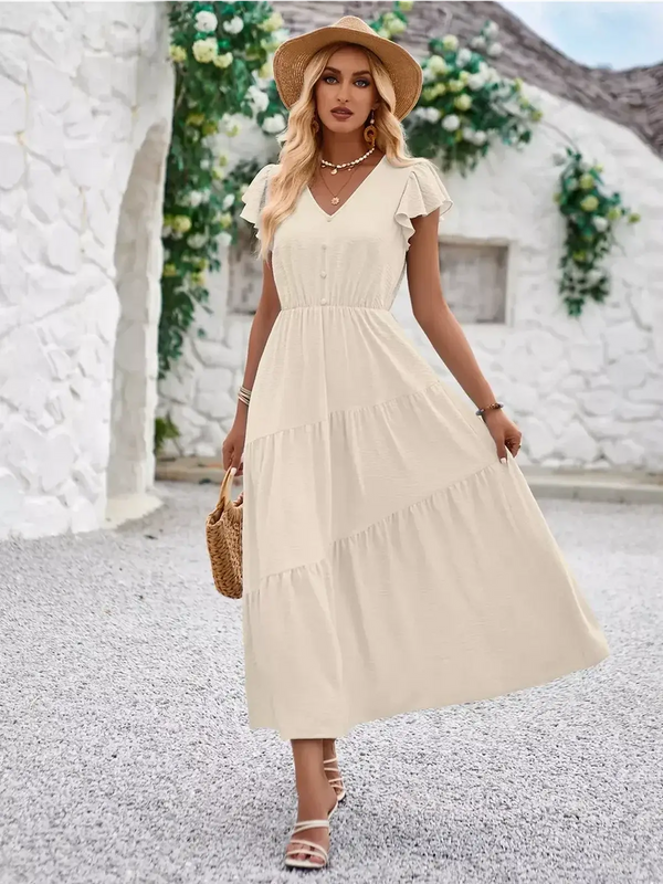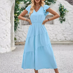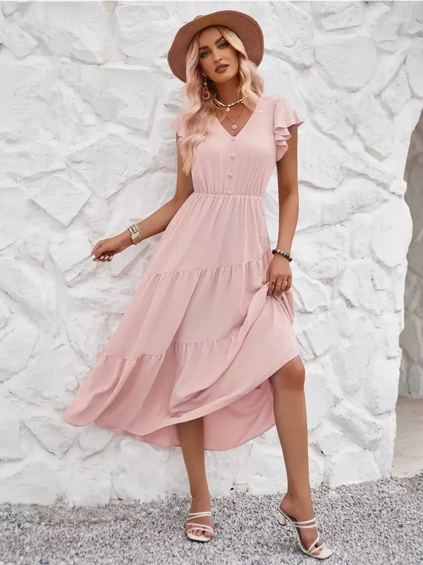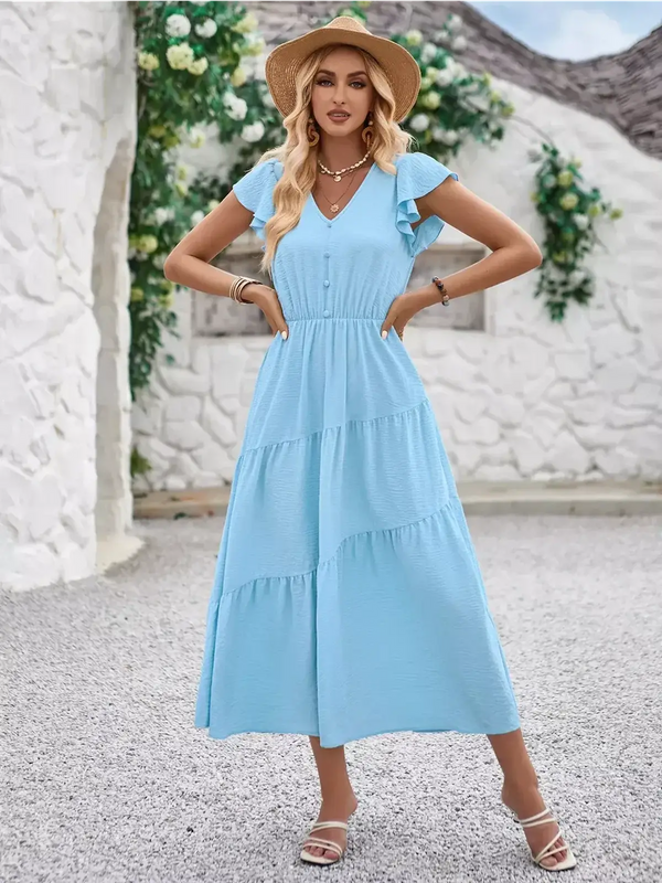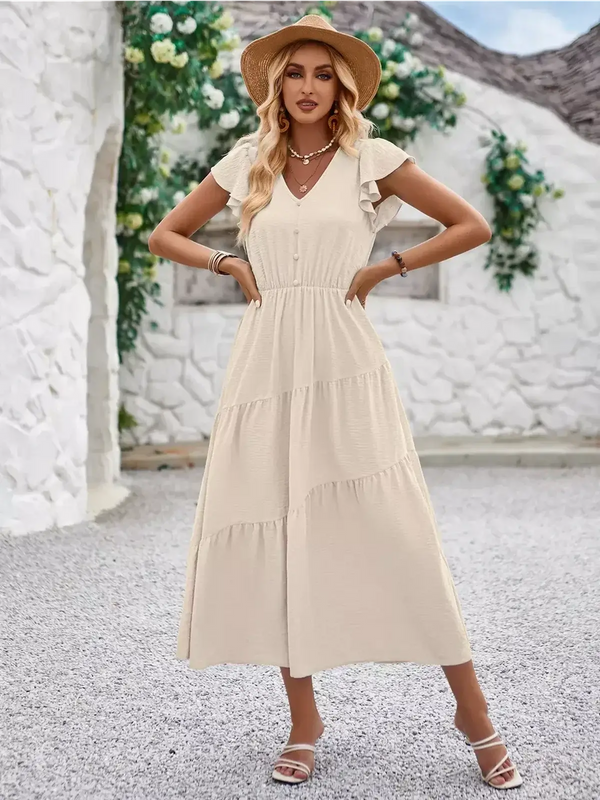 This breezy flutter-sleeve midi dress offers effortless elegance for warm-weather days. Designed with a flattering V-neckline, elastic waistband, and flowing tiered skirt, it combines comfort and feminine charm. The lightweight fabric ensures all-day breathability, making it perfect for garden parties, beach strolls, or casual gatherings. Pair with sandals and a woven bag for a relaxed yet polished look.