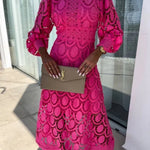 Step into elegance with this intricately designed lace midi dress, crafted for sophisticated evenings and special occasions. Featuring a high neckline, sheer lace sleeves, and a tailored A-line silhouette, this dress blends timeless style with modern allure. The scalloped hemline and delicate lace overlay add a touch of romance, while the midi length ensures refined versatility. Perfect for cocktail parties, weddings, and formal gatherings, this dress is your statement piece for unforgettable moments.