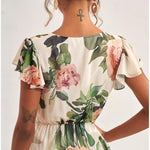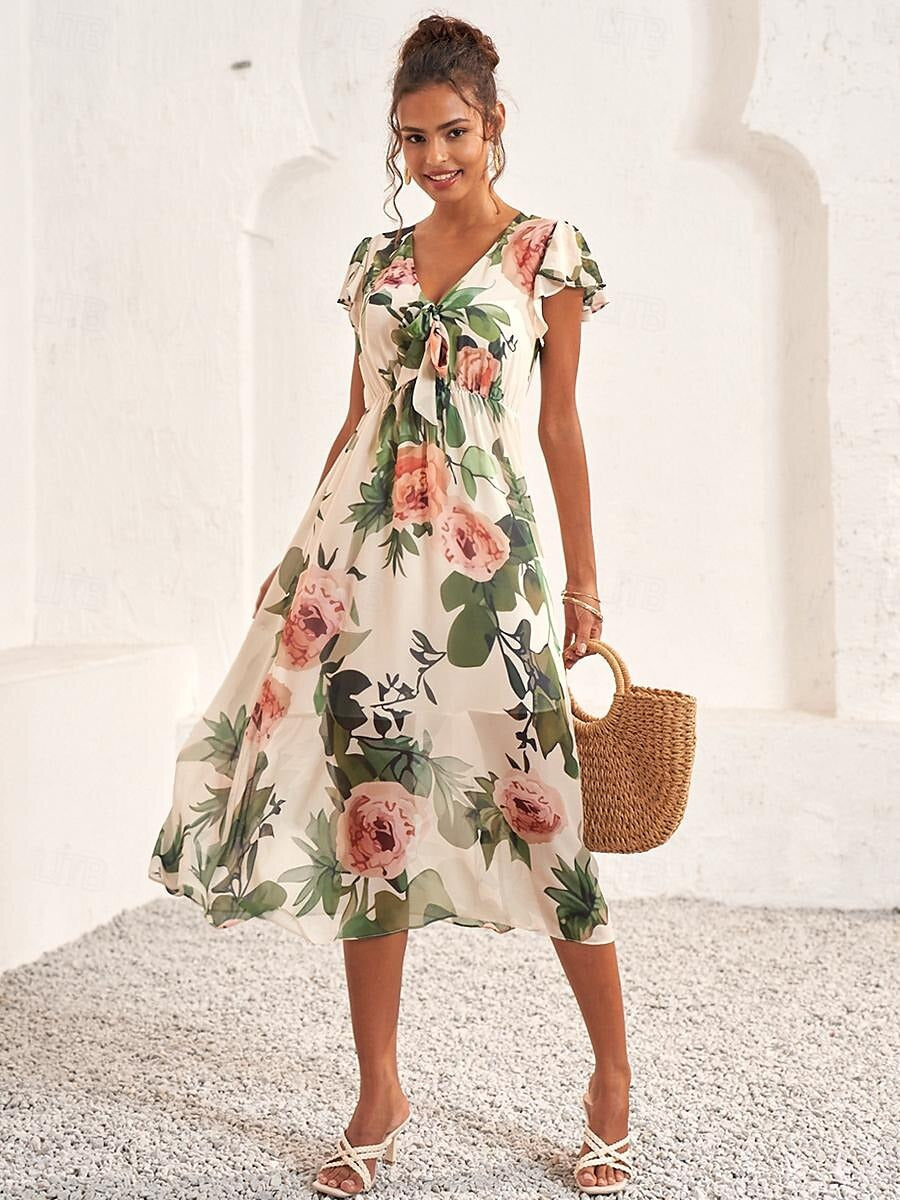Bring effortless charm to your wardrobe with this floral midi dress, designed for a breezy and feminine look. The V-neckline and flutter sleeves add a romantic touch, while the tie-front detail and elastic waist create a flattering silhouette. With its flowy midi skirt, this dress is perfect for warm-weather days, garden parties, or casual evenings out.