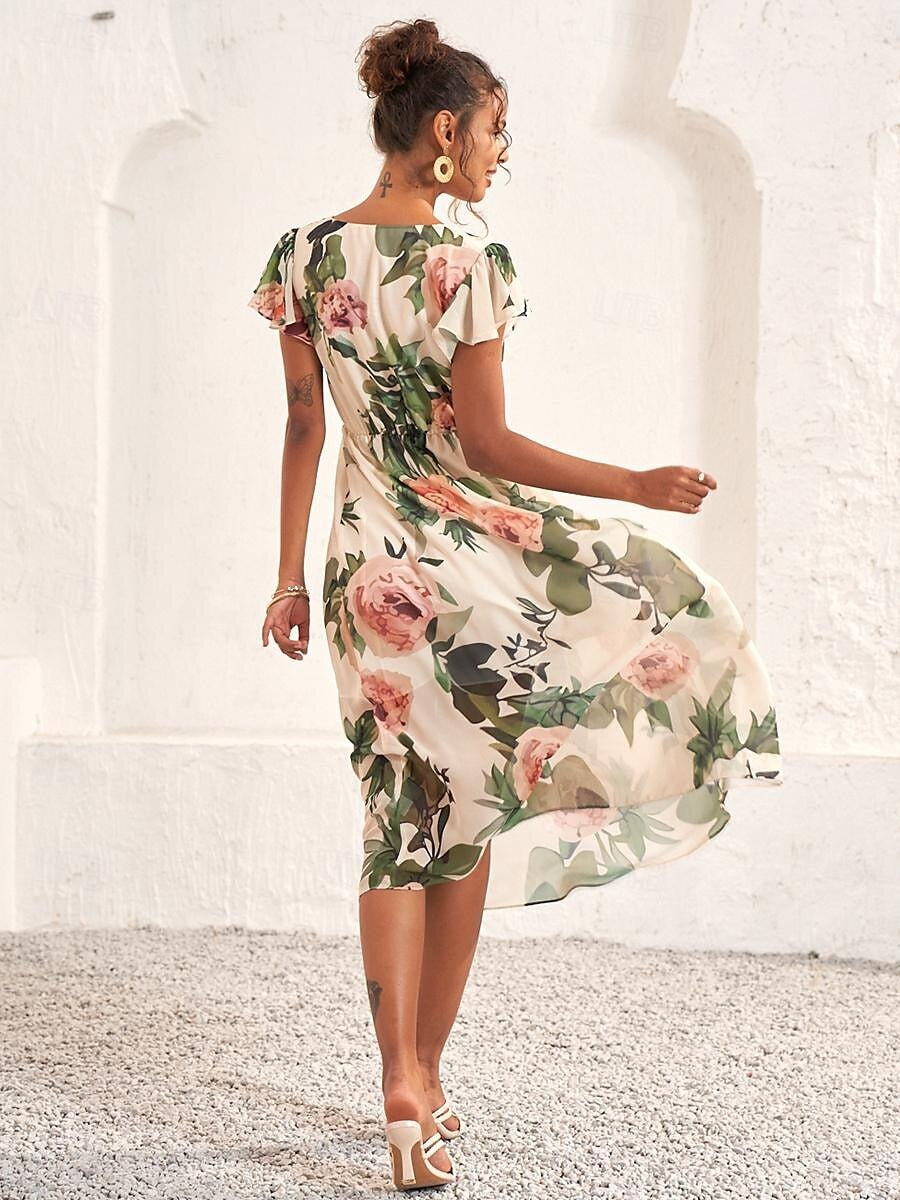 Women’s Midi Dress – Flutter Sleeve V-Neck with Floral Print
