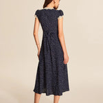 Channel timeless femininity with this navy polka dot midi dress, adorned with delicate lace trim along the plunging V-neckline and cap sleeves. Its fitted bodice and flowy A-line silhouette create a flattering shape, while the tie-back detail enhances the waistline. Perfect for brunch dates, garden parties, or summer evenings, this dress brings a touch of vintage-inspired charm with modern elegance.