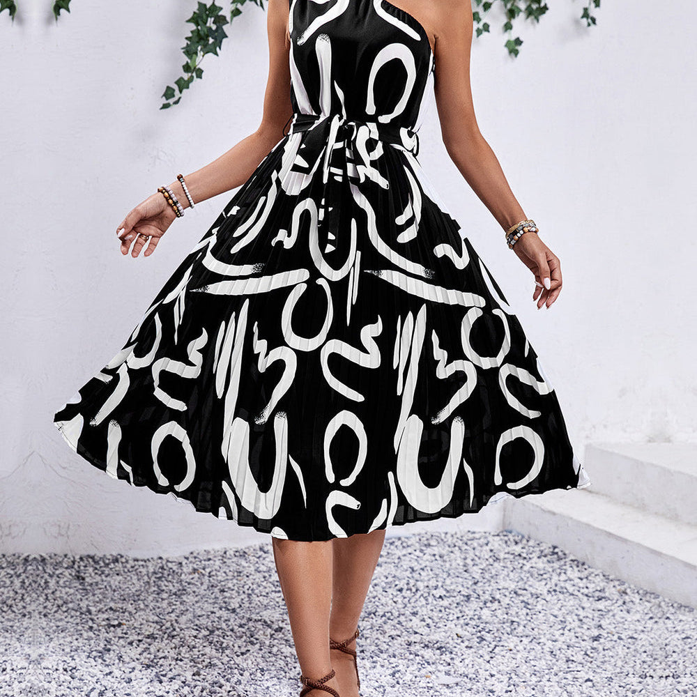 Women’s One-Shoulder Midi Dress – Abstract Print Pleated Belted Design