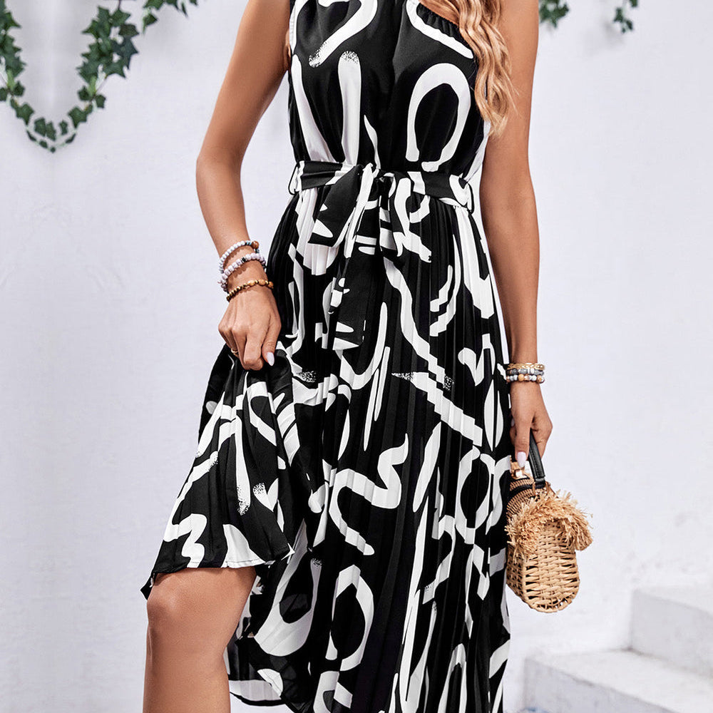 Women’s Pleated Midi Dress – V-Neckline with Abstract Print and Satin Waist Tie