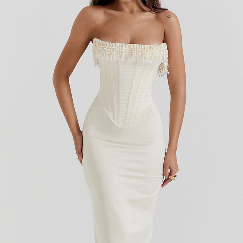 Women’s Strapless Corset Midi Dress – Pearl Beaded Bustier Evening Gown