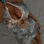 Turn heads in this stunning halter neck mini dress, crafted for sunset cocktails and seaside parties. Featuring a bold sequin-embellished neckline with a plunging cutout, this dress combines sultry elegance with playful charm. The ruched bodycon fit sculpts the silhouette, while the lightweight mesh skirt with drawstring details adds movement and allure. Perfect for vacations, nights out, or tropical getaways.
