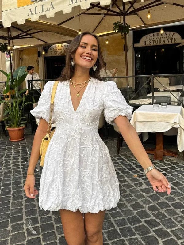 Effortlessly chic, this puff sleeve mini dress is a timeless wardrobe essential. Featuring delicate embroidered detailing and a flattering A-line silhouette, it combines playful charm with elevated design. The deep V-neckline and bubble hemline add a modern touch, making it perfect for brunch dates, city strolls, or daytime events.