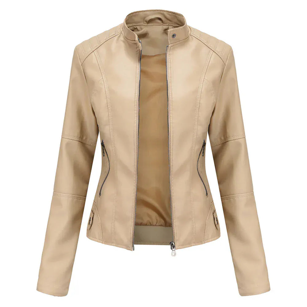 A timeless moto-inspired silhouette with clean lines and contemporary tailoring. The stand collar and asymmetrical zip closure create an effortlessly cool aesthetic, while decorative stitching adds refined detail throughout. Multiple zip pockets provide functional accents that enhance the structured design. A versatile piece that elevates casual looks and adds edge to feminine silhouettes.