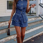 Women’s Sleeveless Denim Peplum Top and Shorts Set – Button Front Detail