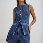 This sleeveless denim co-ord set brings modern tailoring to casual wear with a chic edge. The fitted peplum-style top is detailed with front buttons, structured seams, and slit accents for a flattering silhouette, paired effortlessly with coordinating high-waisted shorts. Designed for versatile styling, this set can be dressed up with boots and a handbag or kept casual with sandals for a relaxed yet polished look.