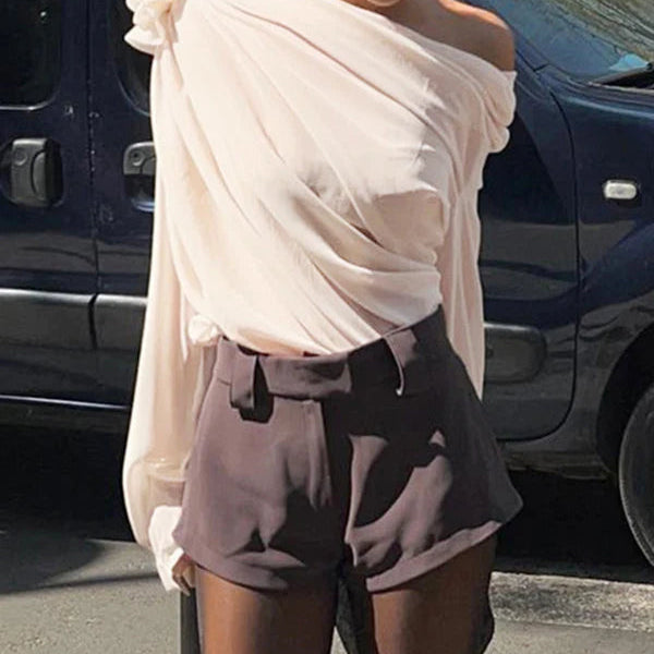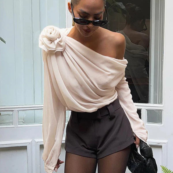 Women’s Off-Shoulder Draped Chiffon Blouse – Long Sleeve Floral Accent Top