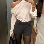 Women’s Off-Shoulder Draped Chiffon Blouse – Long Sleeve Floral Accent Top