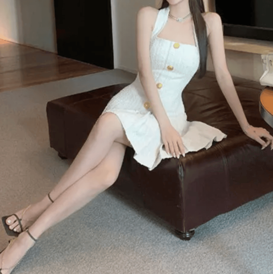 A structured halter silhouette meets playful movement in this crisp, pleated mini. Statement gold-tone buttons draw the eye down the bodice, adding a touch of polish to the softly flared skirt. Best styled with a neutral handbag and minimal jewellery for a clean, elevated finish.