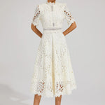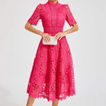 Elevate your wardrobe with this elegant lace midi dress, designed with intricate cut-out embroidery and a flattering A-line silhouette. Featuring a high neckline, short sleeves, and a fitted waist, this dress combines timeless sophistication with modern charm. The delicate lace overlay adds a touch of romance, while the midi length ensures versatile wear for both daytime and evening events. Perfect for weddings, garden parties, or special occasions, this dress is a chic choice that guarantees all eyes on you.