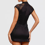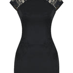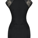 Step into elegance with this lace panel bodycon mini dress, blending modern tailoring with timeless oriental-inspired charm. Designed with a mandarin collar and delicate lace cap sleeves, this dress highlights your silhouette with a figure-hugging fit. Intricate floral embroidery adds a touch of sophistication, while the mini length creates a bold, confident look perfect for evening events, parties, or special occasions.
