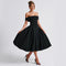 An elegant off-shoulder midi dress designed with a structured bodice and flowing A-line skirt. The folded neckline highlights the shoulders, while the fitted waist transitions into a voluminous silhouette for timeless sophistication. Perfect for cocktail parties, weddings, and evening occasions.